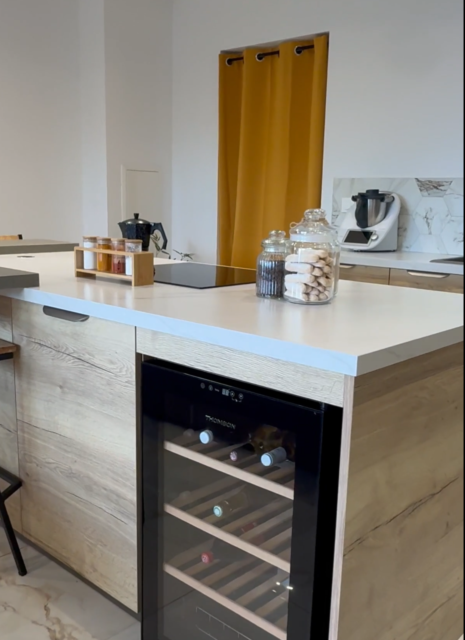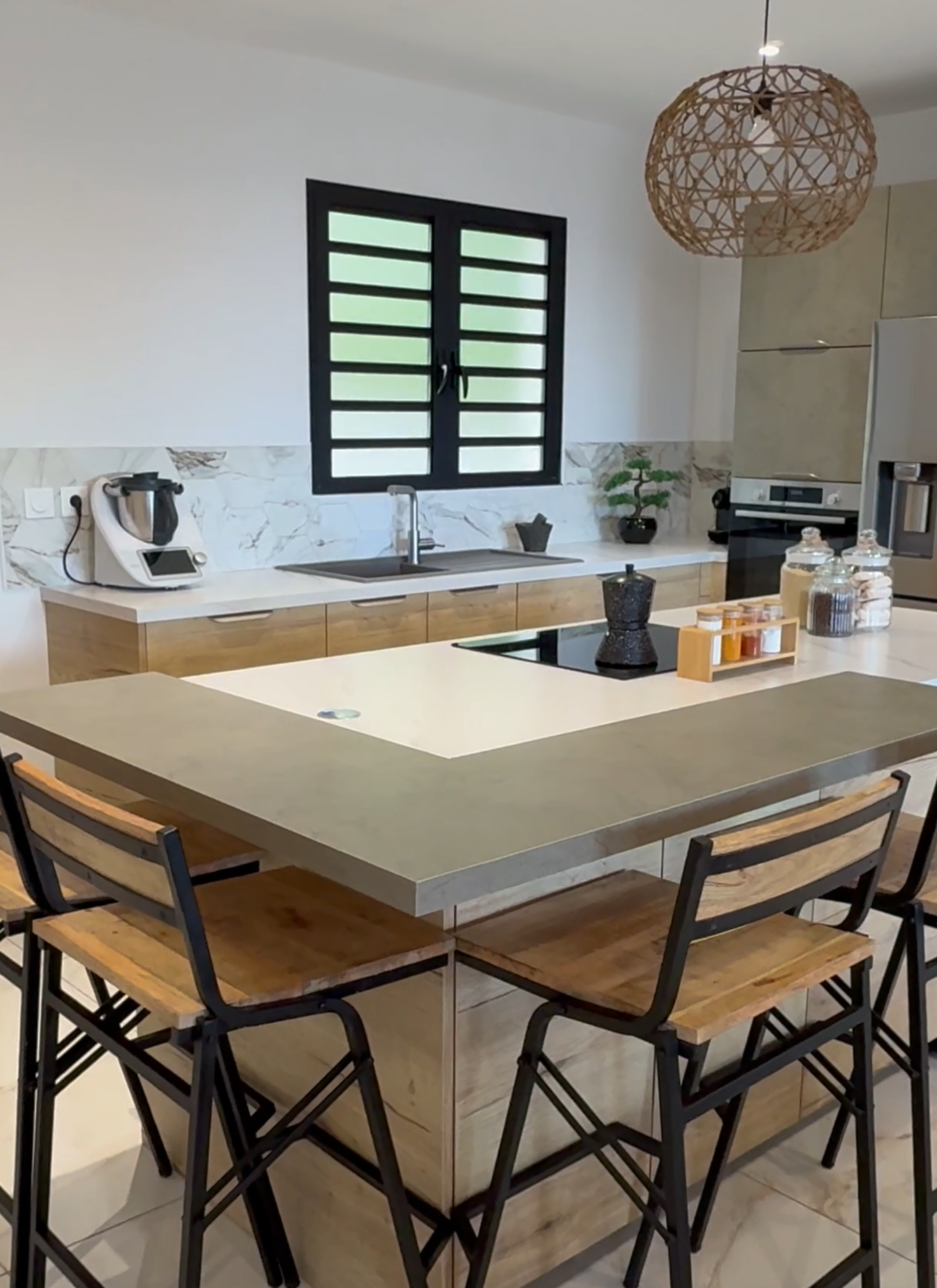 Le coin snack, à la fois convivial et pratique, reprend la teinte béton des armoires colonnes et complète parfaitement l’espace, pour un lieu de vie agréable et fonctionnel.