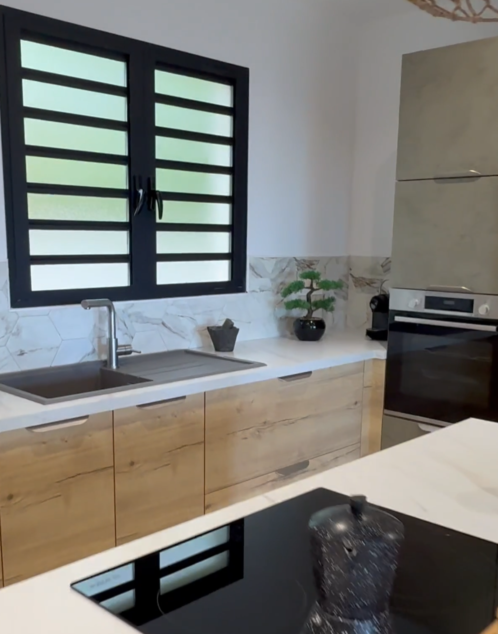Le plan de travail blanc, légèrement nervuré, se marie au sol, reprenant les mêmes tons doux et minéraux.