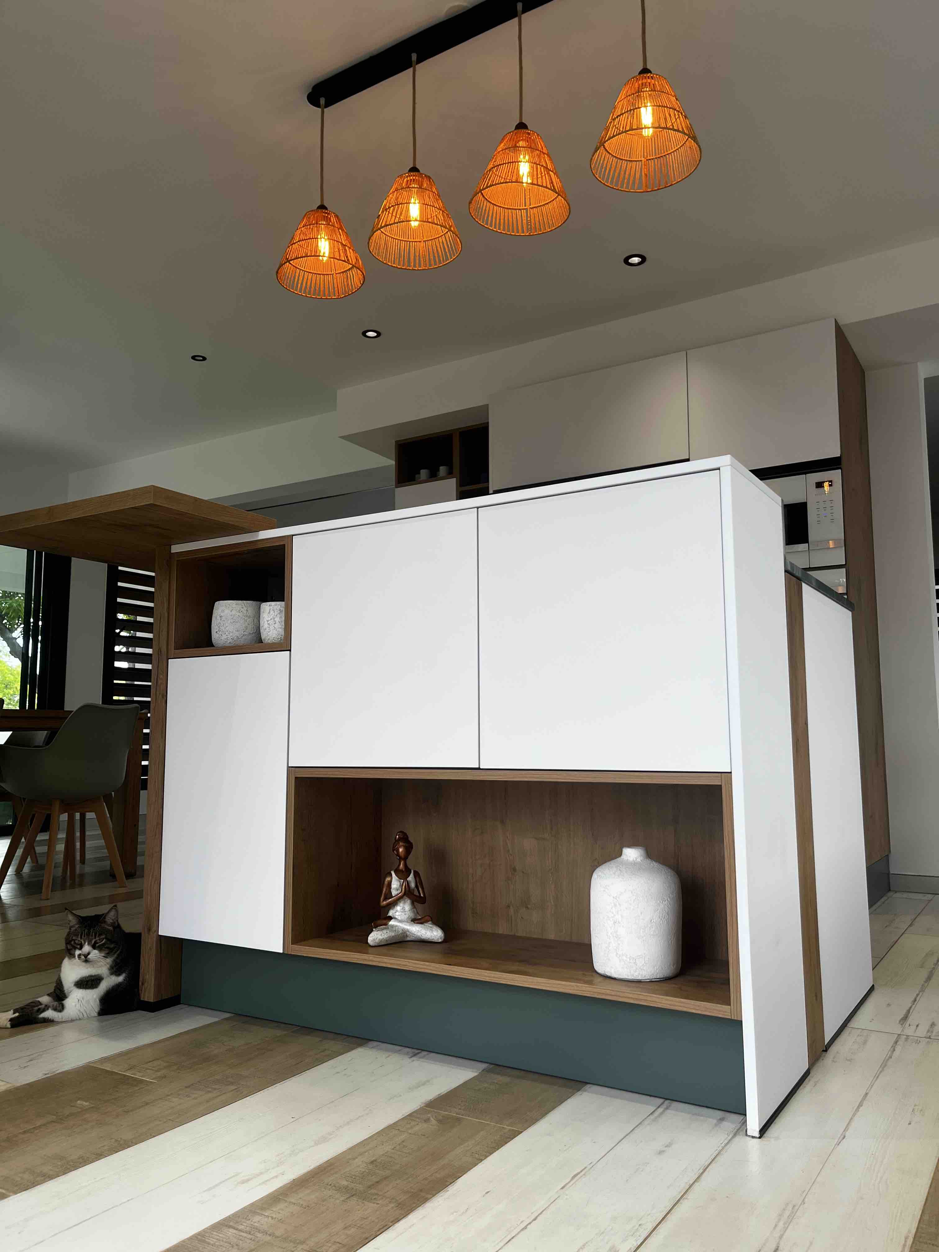 Cette cuisine sur mesure a été conçue pour se démarquer. Son design original, associé à des couleurs hors du commun, casse les codes et apporte du caractère à l’espace. Une création pensée pour une cliente en quête d’originalité et de singularité.